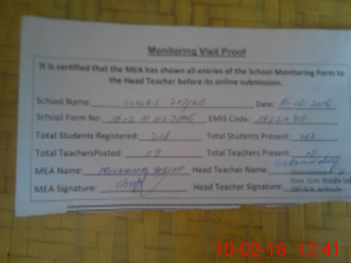 | Certified that this School was Inspected by the Undersigned MEA/DMO Today and the Information Stated Above is as Per Record. | |||||