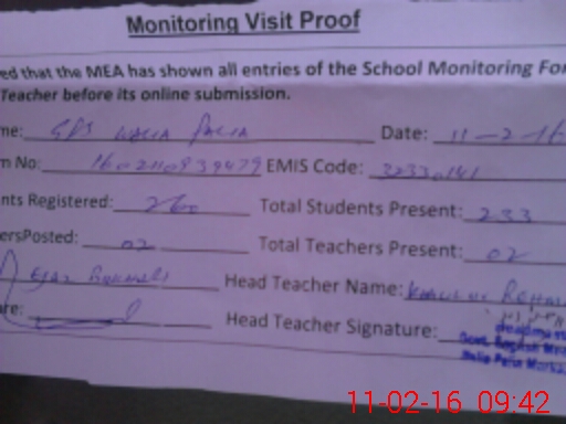 | Attendance Register | Head Teacher | MEA with School | Visit Proof |
