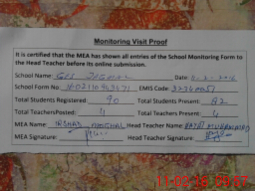 | Attendance Register | Head Teacher | MEA with School | Visit Proof |