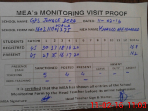 | EMIS Code: 36430225 | Name of School: GPS JUNGLE DARA WALA, TULAMBA | |||