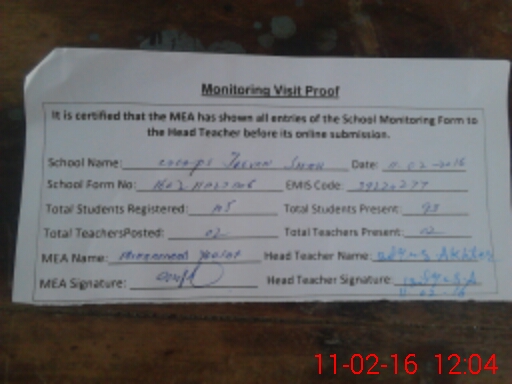 | Attendance Register | Head Teacher | MEA with School | Visit Proof |