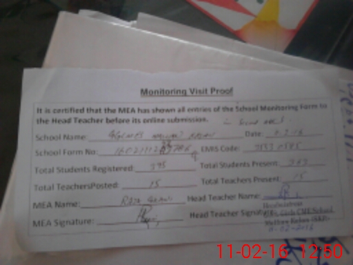 | Attendance Register | Head Teacher | MEA with School | Visit Proof |