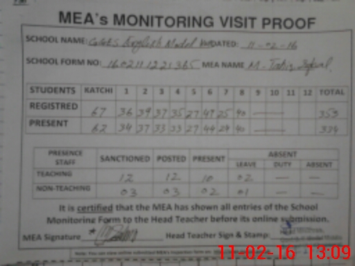 | Certified that this School was Inspected by the Undersigned MEA/DMO Today and the Information Stated Above is as Per Record. | |||||