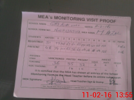 | Attendance Register | Head Teacher | MEA with School | Visit Proof |