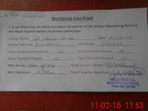 | EMIS Code: 31330343 | Name of School: GPS CHAK NO. 59 NP | |||