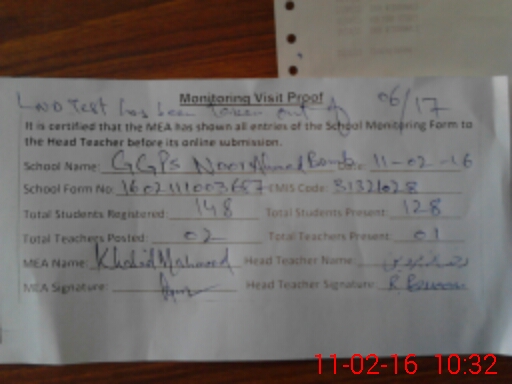 | Certified that this School was Inspected by the Undersigned MEA/DMO Today and the Information Stated Above is as Per Record. | |||||