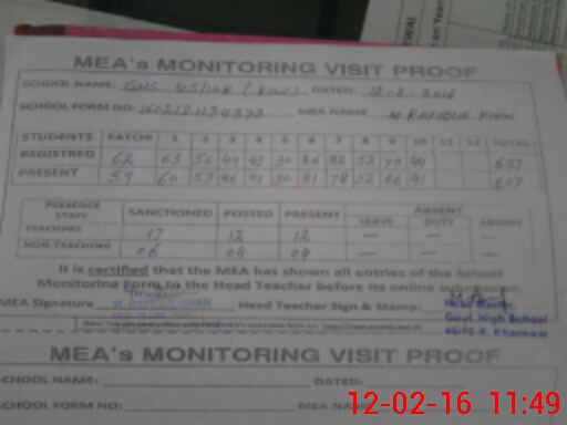 | Certified that this School was Inspected by the Undersigned MEA/DMO Today and the Information Stated Above is as Per Record. | |||||