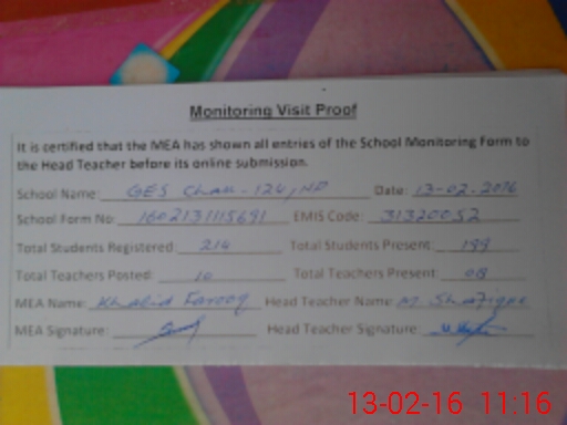 | EMIS Code: 31320052 | Name of School: GHS CHAK NO. 124 NP | |||