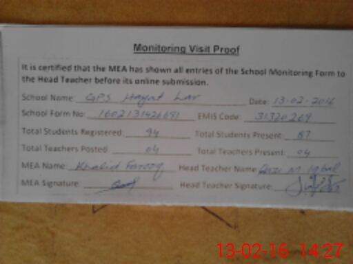 | EMIS Code: 31320269 | Name of School: GPS HAYAT LAR | |||