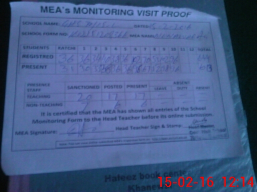| Attendance Register | Head Teacher | MEA with School | Visit Proof |