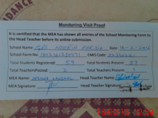 | EMIS Code: 32340261 | Name of School: GPS NOORIA FARIDIA | |||
