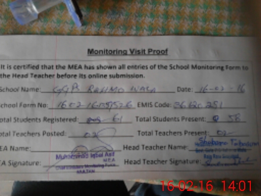 | Attendance Register | Head Teacher | MEA with School | Visit Proof |