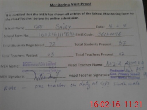 | EMIS Code: 36120096 | Name of School: GPS SAIRY P/O JALAL PUR KHAKHI | |||