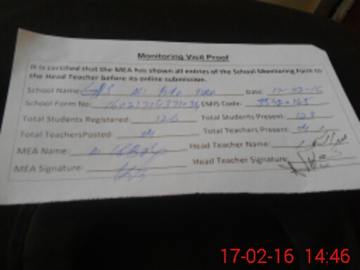 | Attendance Register | Head Teacher | MEA with School | Visit Proof |