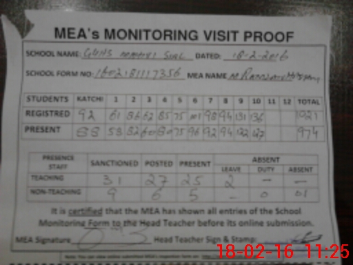 | Certified that this School was Inspected by the Undersigned MEA/DMO Today and the Information Stated Above is as Per Record. | |||||