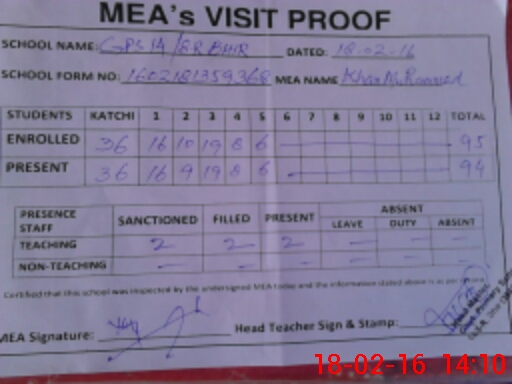 | Attendance Register | Head Teacher | MEA with School | Visit Proof |