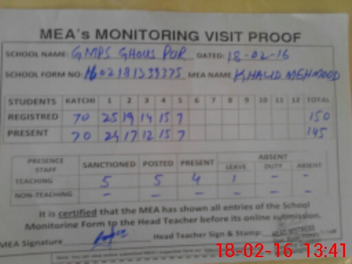 | Attendance Register | Head Teacher | MEA with School | Visit Proof |