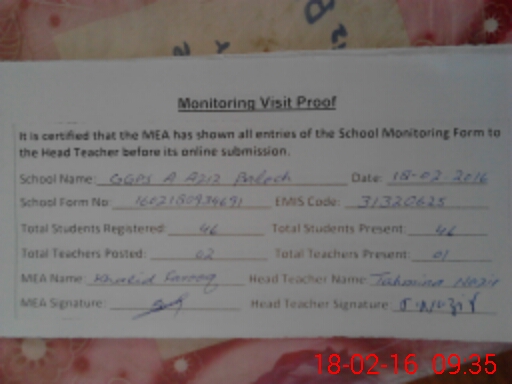 | EMIS Code: 31320625 | Name of School: GGPS ABDUL AZIZ BALOCH | |||