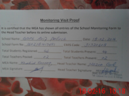 | EMIS Code: 31320608 | Name of School: GGPS ARIF BALOOCH | |||