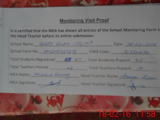 | Attendance Register | Head Teacher | MEA with School | Visit Proof |