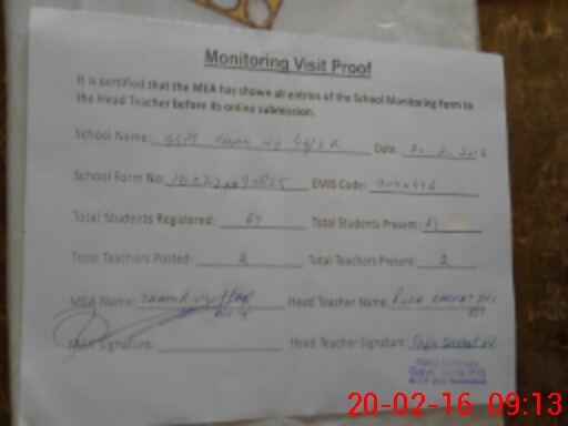 | Attendance Register | Head Teacher | MEA with School | Visit Proof |
