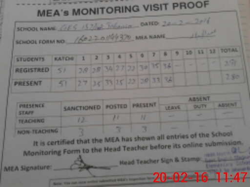 | Attendance Register | Head Teacher | MEA with School | Visit Proof |