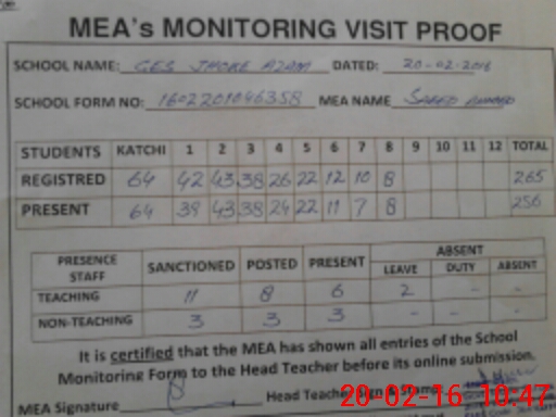 | Attendance Register | Head Teacher | MEA with School | Visit Proof |