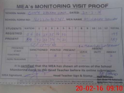 | Attendance Register | Head Teacher | MEA with School | Visit Proof |