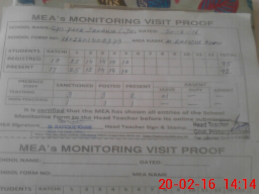 | Attendance Register | Head Teacher | MEA with School | Visit Proof |