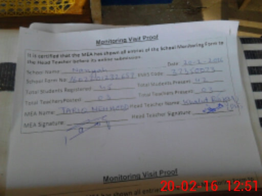 | Attendance Register | Head Teacher | MEA with School | Visit Proof |