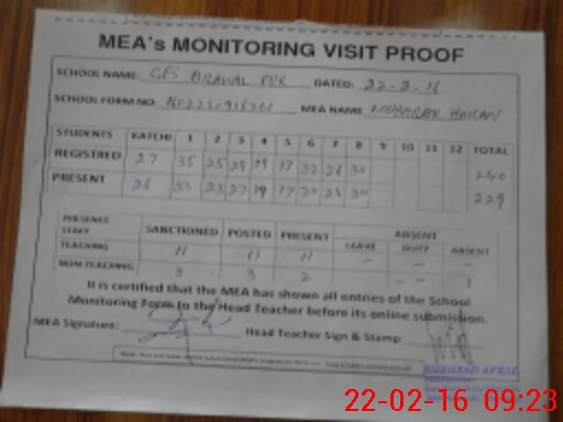 | Attendance Register | Head Teacher | MEA with School | Visit Proof |