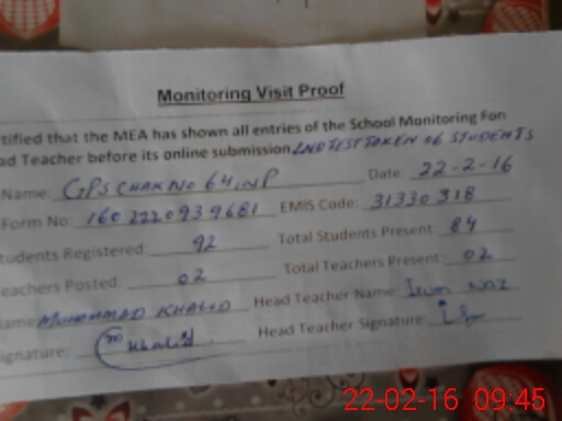 | EMIS Code: 31330318 | Name of School: GPS CHAK NO. 64/NP | |||