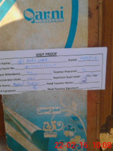 | School Visited by School Health & Nutrition Supervisor (No. of Visits) | 1 | Name1: | Karim Nawaz Mszari | Name2: | |