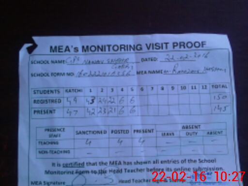 | Attendance Register | Head Teacher | MEA with School | Visit Proof |