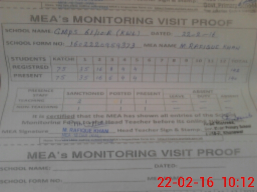 | Attendance Register | Head Teacher | MEA with School | Visit Proof |