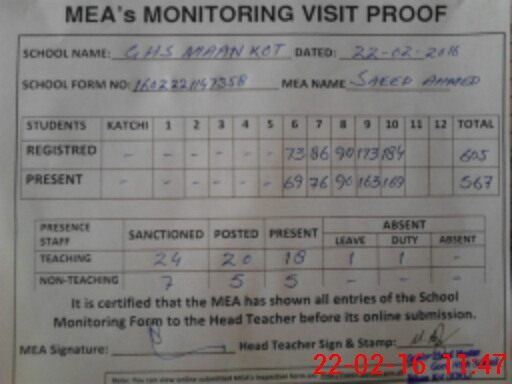 | Attendance Register | Head Teacher | MEA with School | Visit Proof |