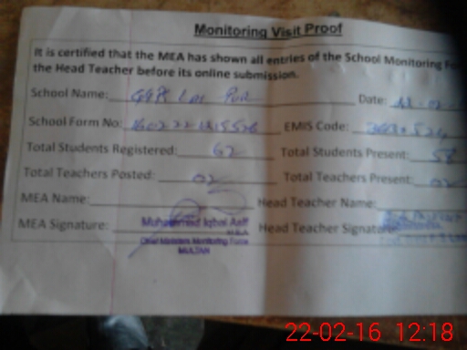 | Certified that this School was Inspected by the Undersigned MEA/DMO Today and the Information Stated Above is as Per Record. | |||||