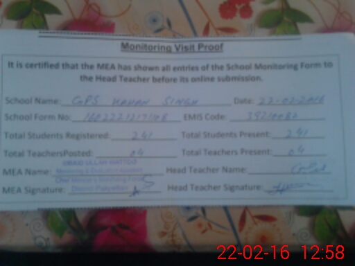 | Certified that this School was Inspected by the Undersigned MEA/DMO Today and the Information Stated Above is as Per Record. | |||||