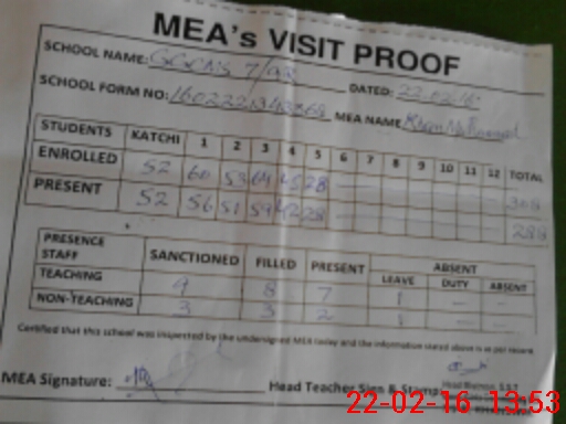 | Attendance Register | Head Teacher | MEA with School | Visit Proof |