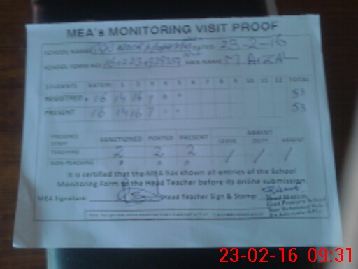 | Attendance Register | Head Teacher | MEA with School | Visit Proof |