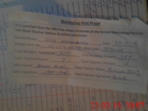 | Attendance Register | Head Teacher | MEA with School | Visit Proof |