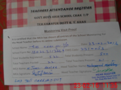 | EMIS Code: 31310053 | Name of School: GHS CHAK NO 7/P KHANPUR | |||