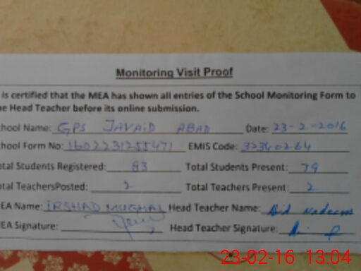 | EMIS Code: 32340264 | Name of School: GPS S JAVAID ABAD | |||
