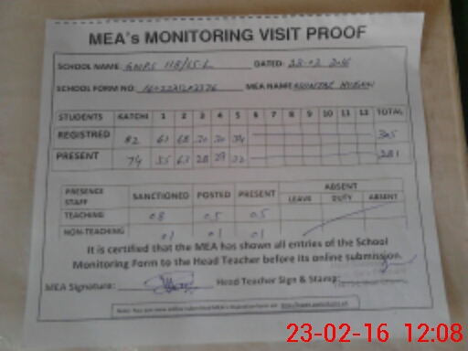 | Attendance Register | Head Teacher | MEA with School | Visit Proof |