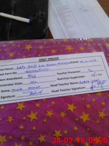 | School Visited by School Health & Nutrition Supervisor (No. of Visits) | 1 | Name1: | KHIZAR HAYAT | Name2: | NIL |