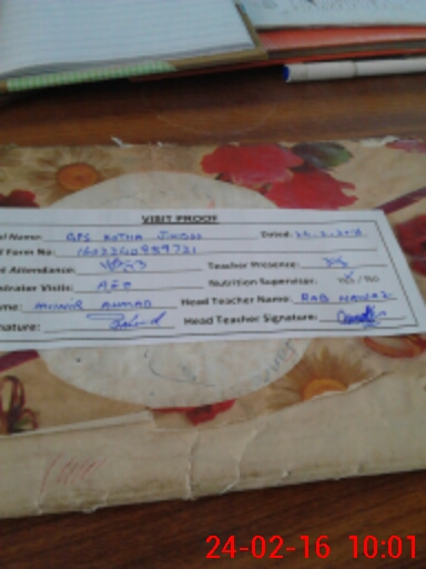 | School Visited by School Health & Nutrition Supervisor (No. of Visits) | 1 | Name1: | KHIZAR HAYAT | Name2: | NIL |