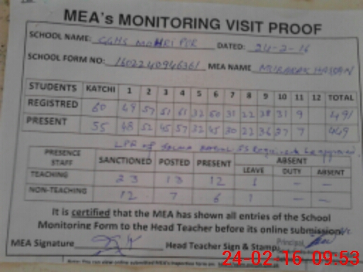 | Attendance Register | Head Teacher | MEA with School | Visit Proof |