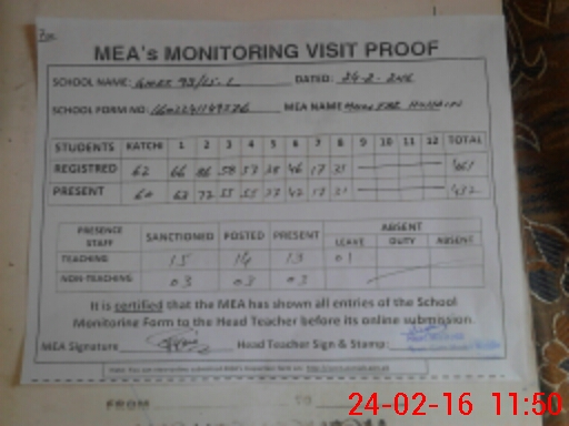 | Attendance Register | Head Teacher | MEA with School | Visit Proof |