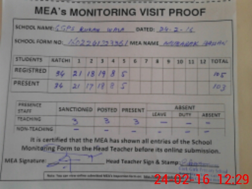 | Attendance Register | Head Teacher | MEA with School | Visit Proof |