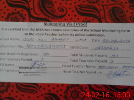 | Attendance Register | Head Teacher | MEA with School | Visit Proof |